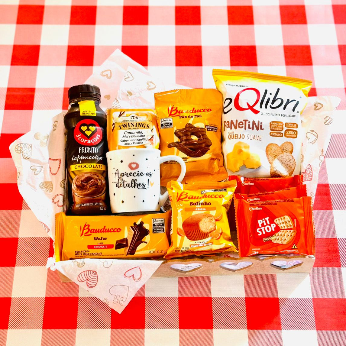Servida sobre uma elegante bandeja coração grande, ela combina o aconchego do chá Twinings e do cappuccino pronto 3 Corações com delícias leves e afetivas, como bolinhos, biscoitos e o crocante irresistível do panetini sabor queijo. A caneca com frase especial sela o presente com emoção, tornando-o ideal para quem aprecia os detalhes e valoriza pequenos prazeres.