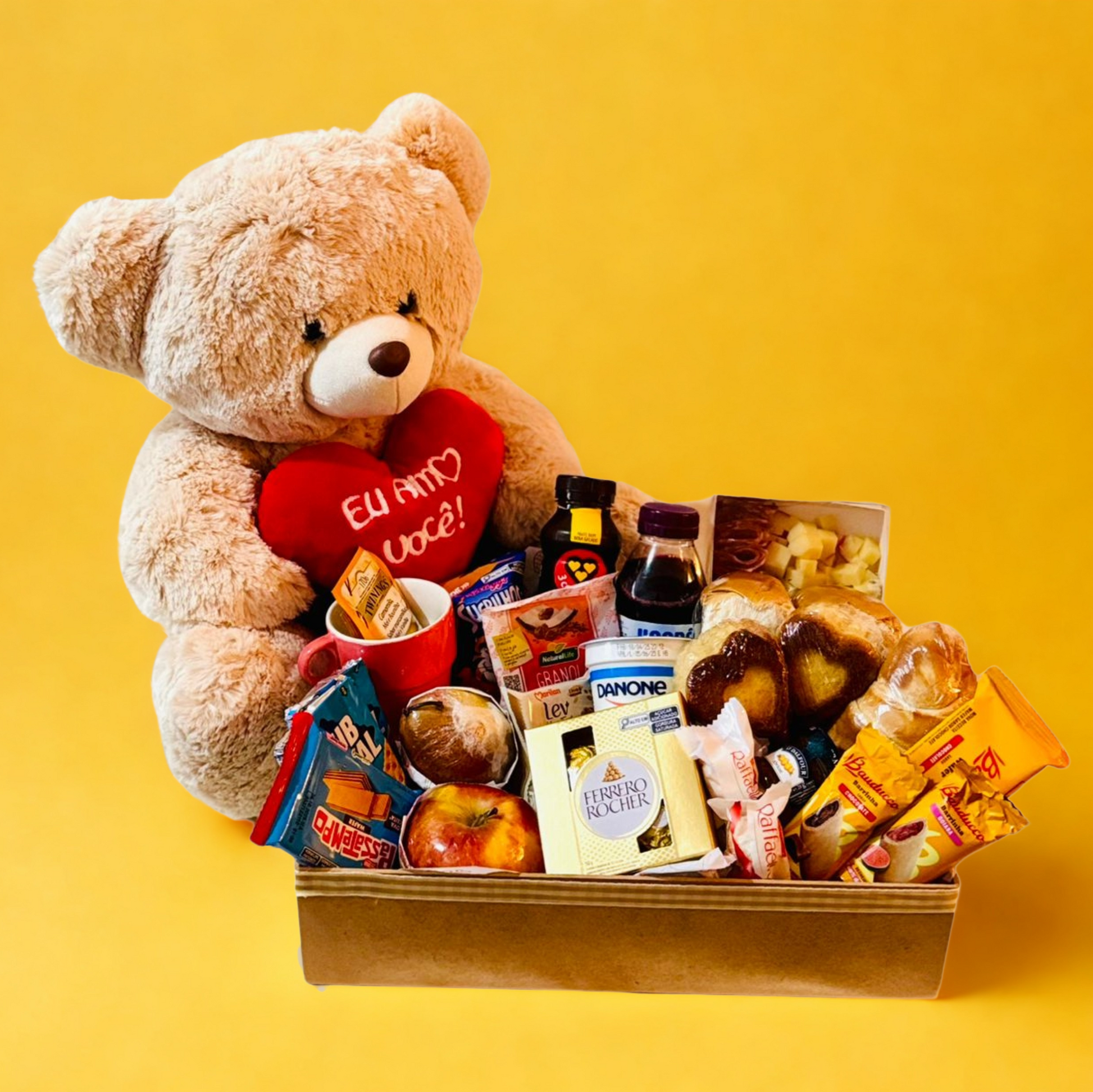 O protagonista dessa experiência é o urso de pelúcia em tamanho G, abraçando um coração com a mensagem “Eu te amo” — símbolo de um afeto sincero e eterno. Acompanhado de uma seleção sofisticada e generosa, esta cesta reúne itens frescos, artesanais e especiais: como pães de fabricação própria, frutas selecionadas, mix de queijos e frios, bombons Ferrero e Raffaello, iogurte, suco natural, chá Twinings e muito mais.