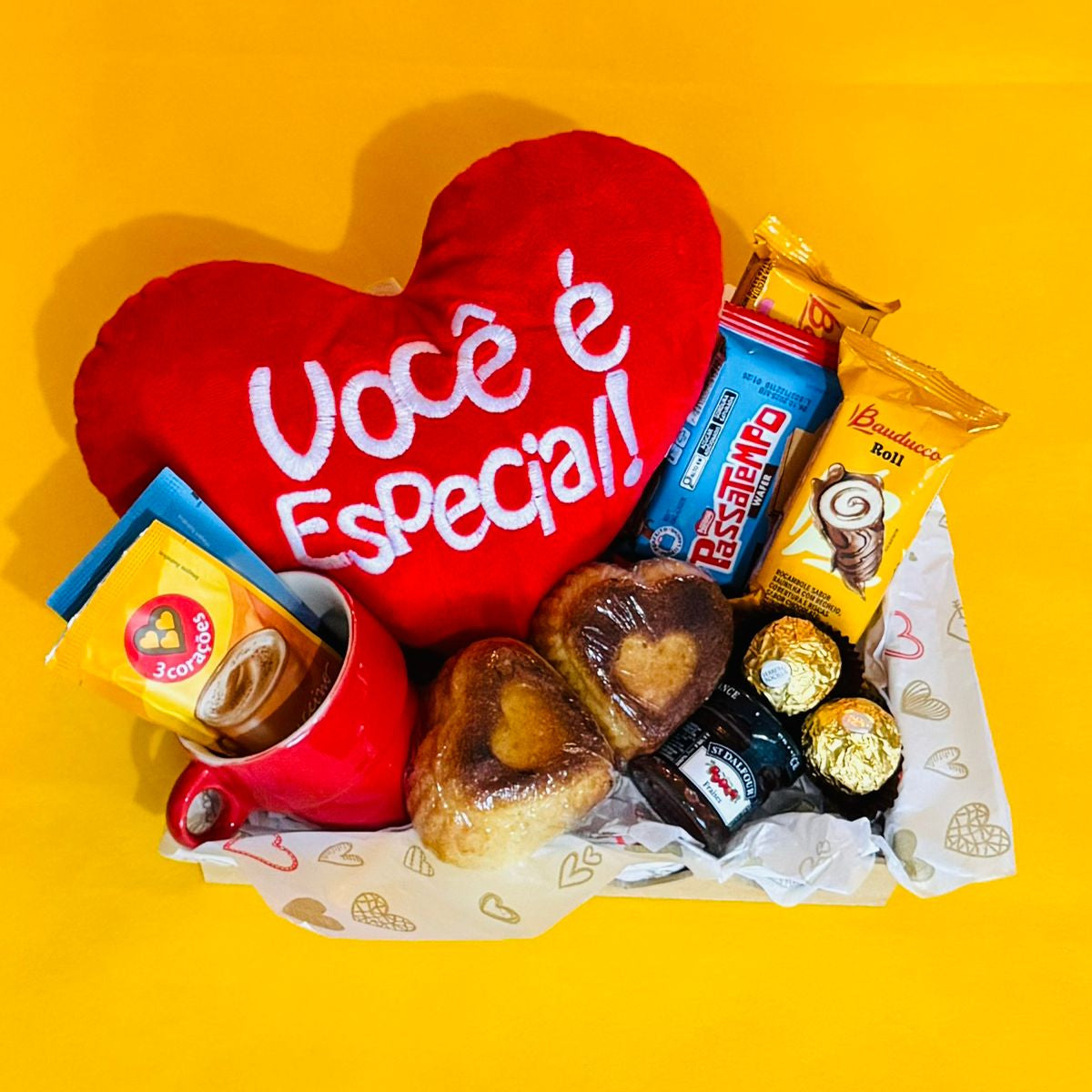 A almofada em formato de coração, com a mensagem “Você é especial”, é o símbolo desse gesto que emociona. Acompanhada da xícara vermelha, cafés aromáticos, bolinhos artesanais e um toque doce de Ferrero Rocher, essa cesta é ideal para transformar o cotidiano em um instante de cuidado.
