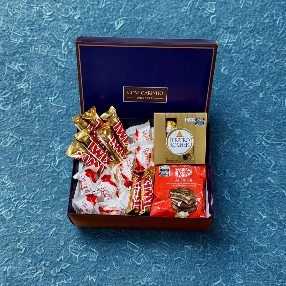 O Grandh’A Azul de Encanto é uma celebração dos sentidos. Dentro da charmosa caixa de presente azul, uma seleção de chocolates marcantes desperta emoções com cada mordida: são 7 bombons Raffaello, envoltos em coco e amêndoas, 8 unidades de Twix recheado com caramelo, um alfajor Kit Kat com cobertura de chocolate, e uma elegante caixa de bombons Ferrero Rocher com 4 unidades — um verdadeiro convite à indulgência.