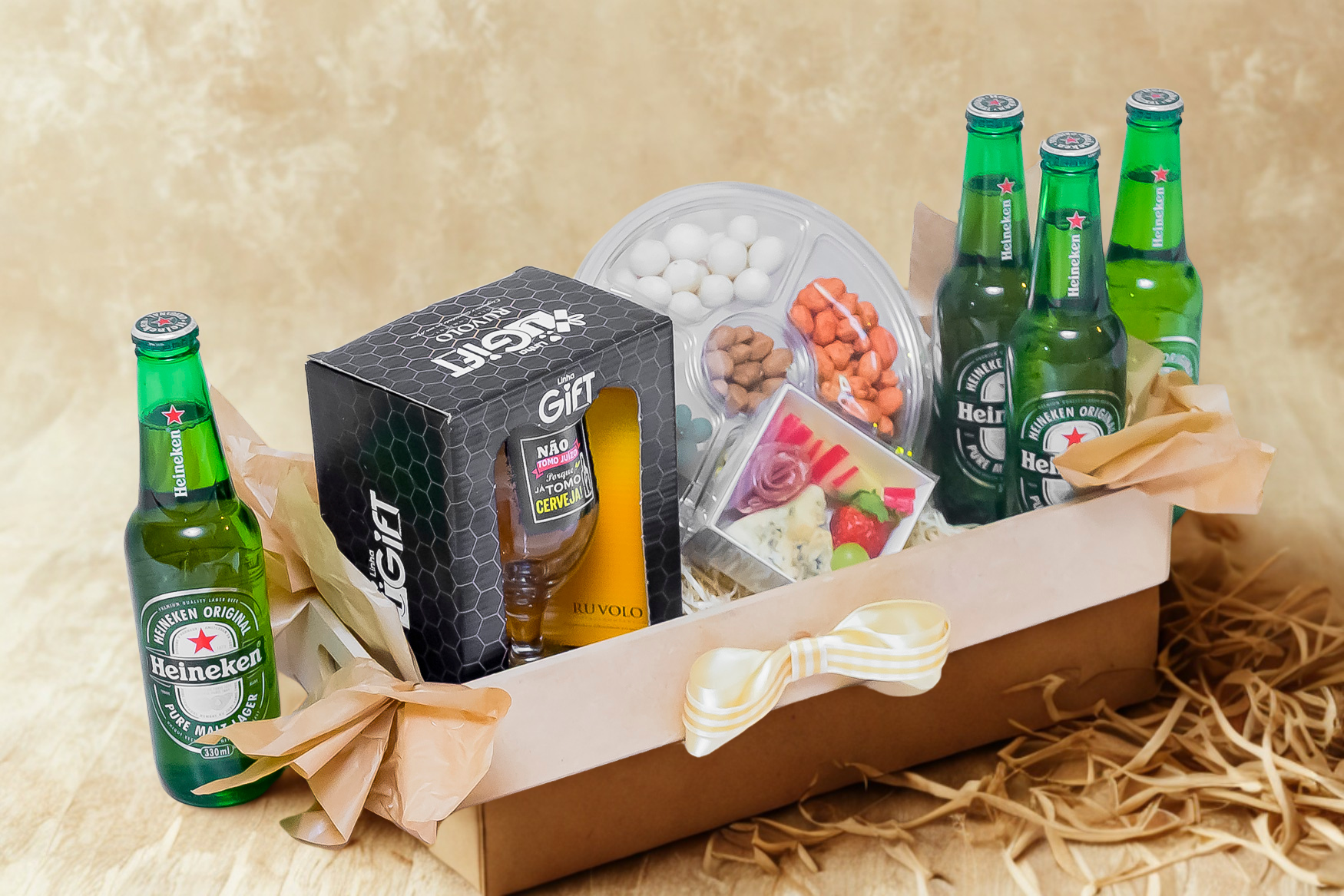 O Grandh’A Brinde & Sabor é um presente pensado para quem aprecia os pequenos prazeres da vida: uma boa cerveja, petiscos selecionados e o gesto de ser lembrado com carinho. A composição inclui 4 long necks de Heineken, acompanhadas de uma elegante taça para cerveja com frase especial (Não tomo juízo, porque já tomo Cerveja) — perfeita para brindar com personalidade.