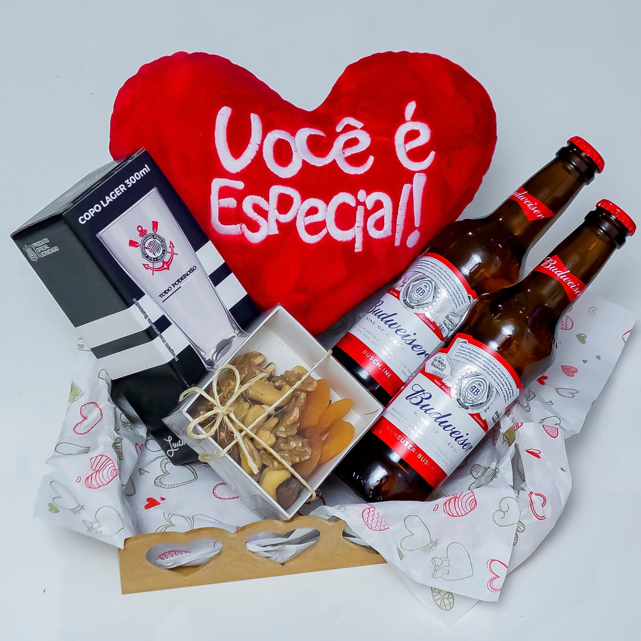 O Grandh’A Paixão & Torcida foi pensado para quem valoriza momentos simples, mas cheios de significado. A almofada em formato de coração (média) simboliza o afeto, enquanto a taça de time licenciada traz a paixão pelo futebol para o centro da experiência. As duas cervejas Budweiser long neck são ideais para um brinde descontraído, acompanhadas de um saboroso mix de castanhas premium (130g) — uma seleção que combina bem-estar e prazer.