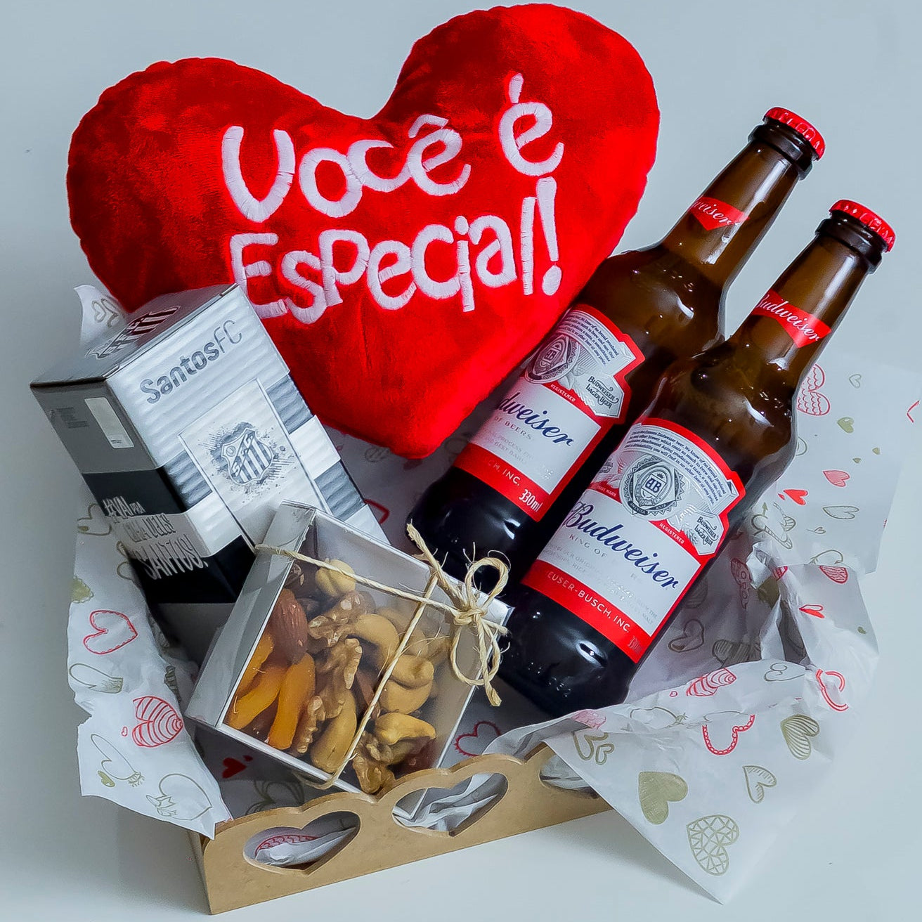 O Grandh’A Paixão & Torcida foi pensado para quem valoriza momentos simples, mas cheios de significado. A almofada em formato de coração (média) simboliza o afeto, enquanto a taça de time licenciada traz a paixão pelo futebol para o centro da experiência. As duas cervejas Budweiser long neck são ideais para um brinde descontraído, acompanhadas de um saboroso mix de castanhas premium (130g) — uma seleção que combina bem-estar e prazer.