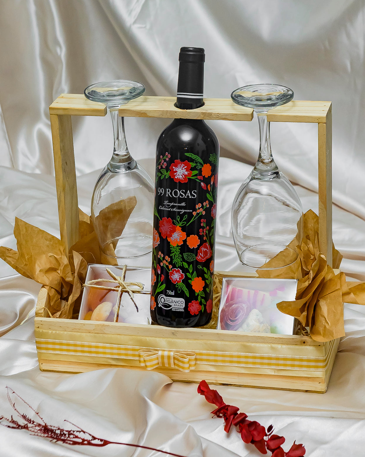 No centro da composição, o vinho tinto espanhol 99 Rosas — um rótulo orgânico, de edição especial, com personalidade marcante e notas elegantes que revelam um terroir vibrante e respeitoso com a natureza. Servido em duas taças de vidro refinadas, ele convida à contemplação, ao afeto e à presença.