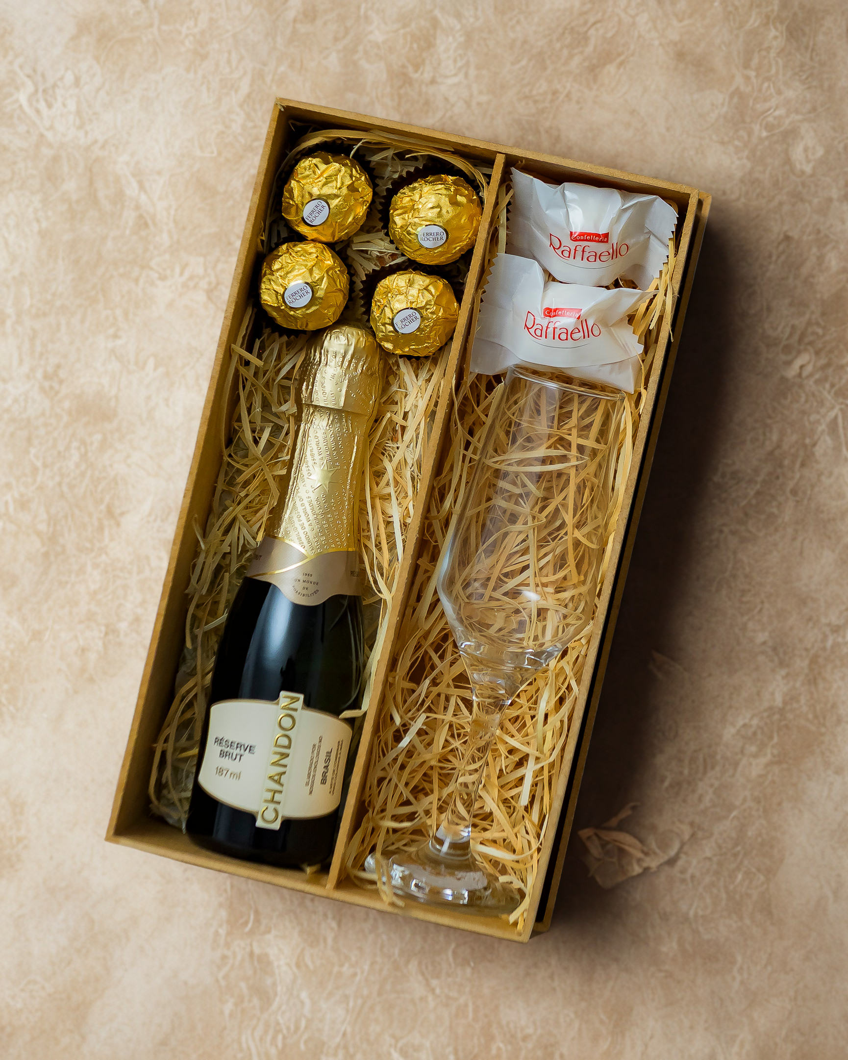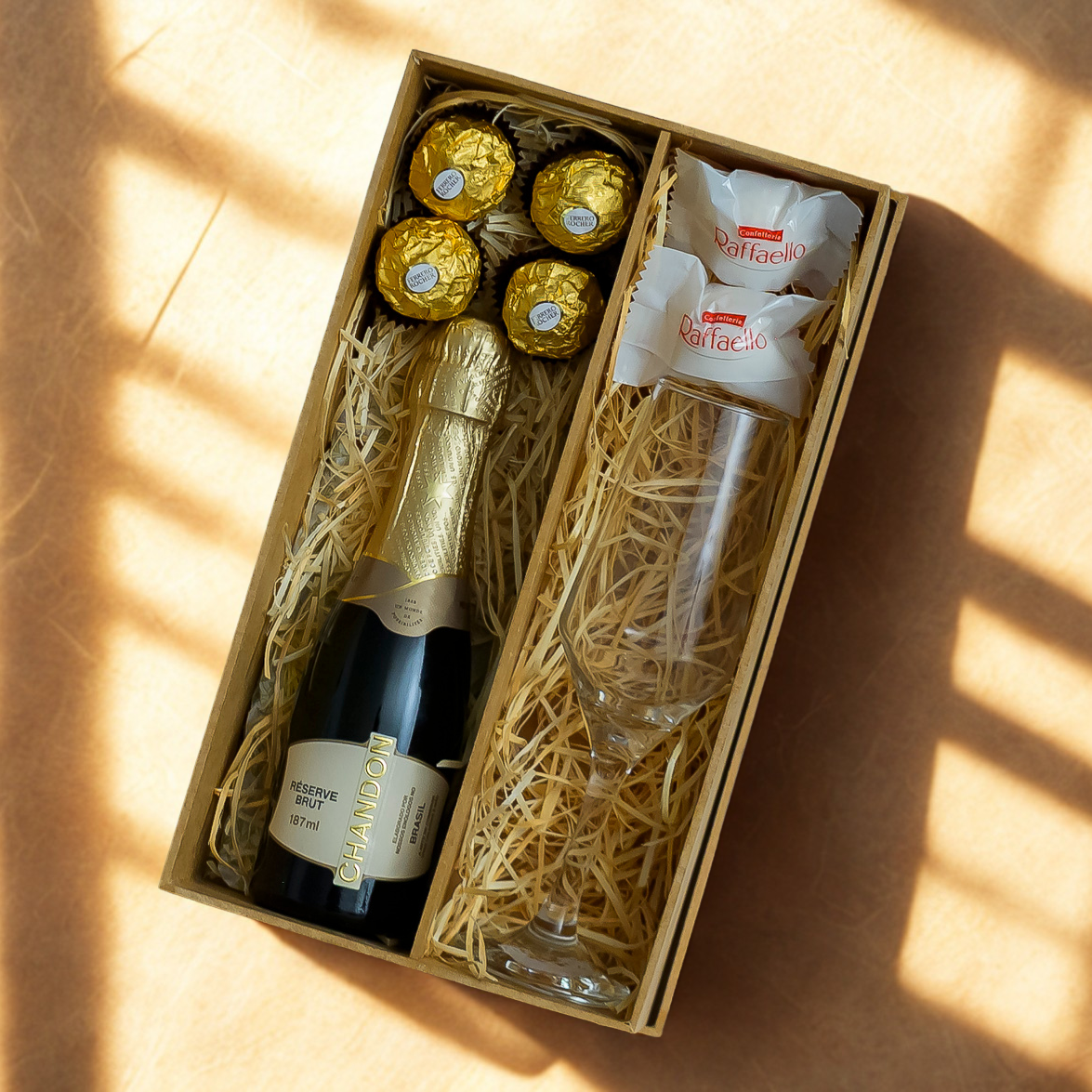 Com o espumante Chandon Brut Baby — leve, refrescante e versátil —, essa composição é ideal para um brinde intimista, acompanhado por uma taça de vidro que torna o momento ainda mais simbólico. Os bombons Ferrero Rocher e Raffaello complementam com texturas delicadas, equilibrando o paladar entre o clássico e o surpreendente.
