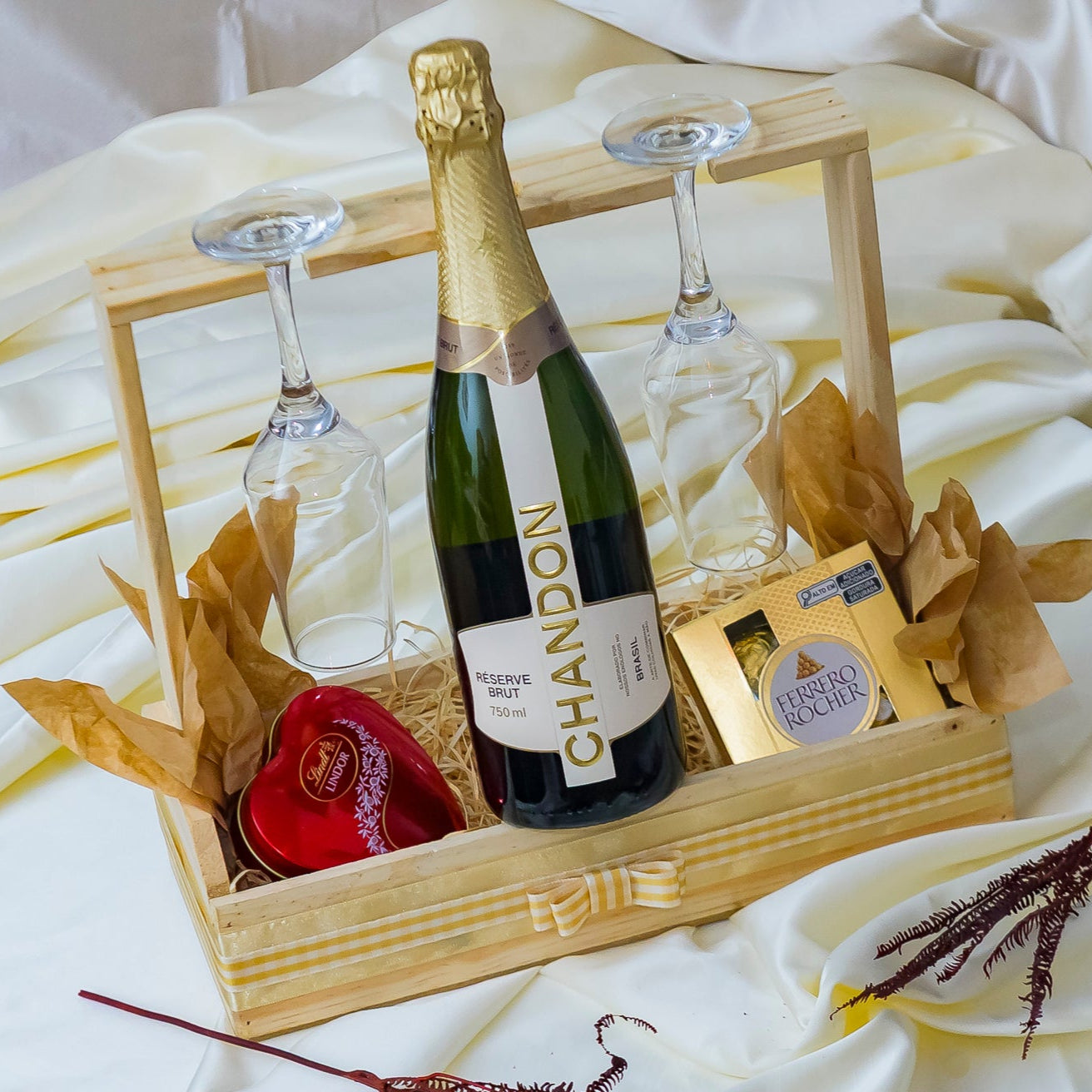 No centro da composição, o icônico Chandon Brut, espumante brasileiro de excelência internacional, com notas cítricas, frescor vibrante e perlage refinado. Acompanhado por duas taças de vidro e um porta-vinho com suporte exclusivo, ele entrega mais do que um presente: entrega uma experiência.