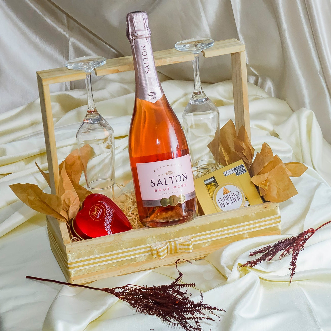 O protagonista da experiência é o Salton Rosé Brut, espumante brasileiro refrescante, com coloração rosada encantadora, notas florais e frutas vermelhas. Acompanhado por duas taças de vidro e apresentado em um porta-vinho com suporte exclusivo para taças, ele oferece uma atmosfera sofisticada e acolhedora.